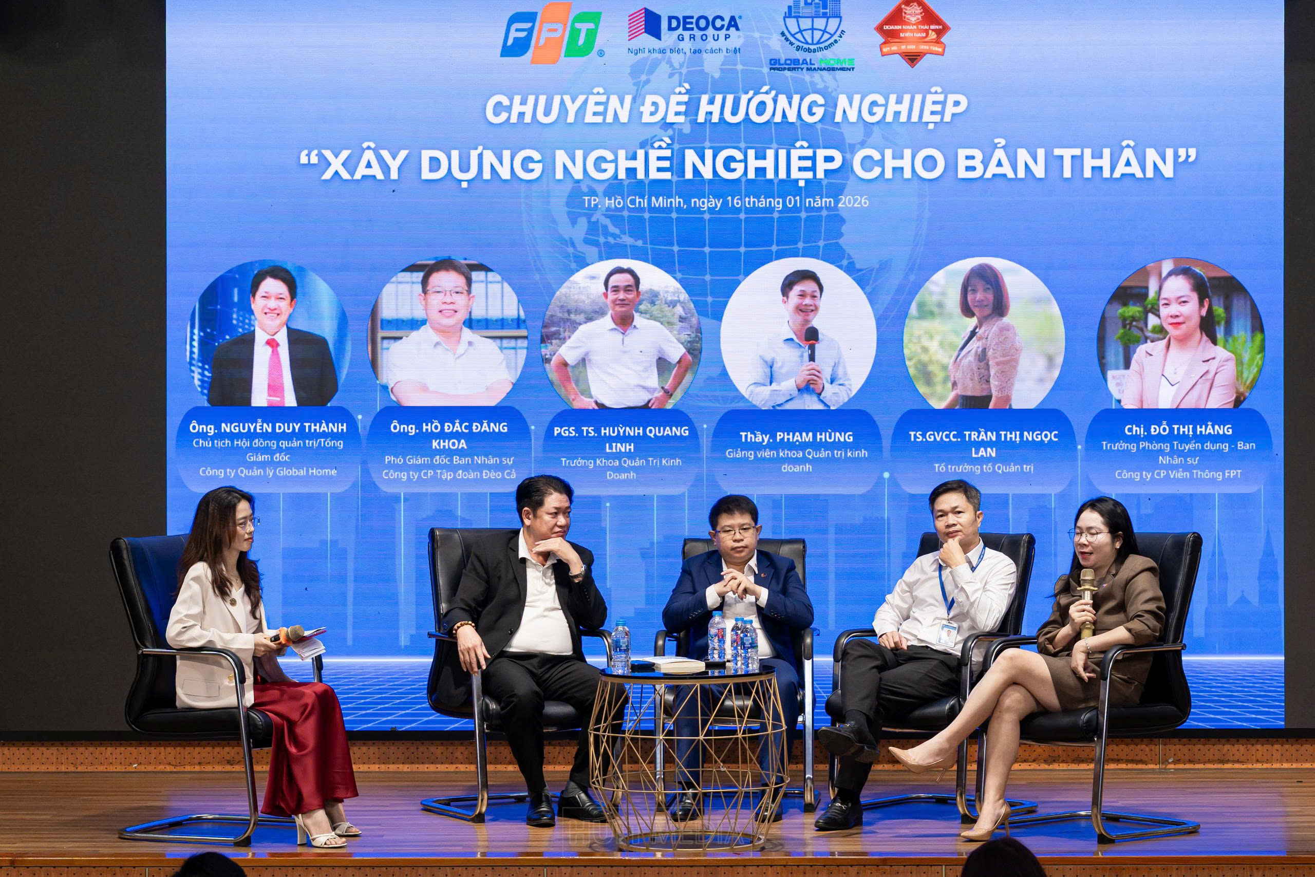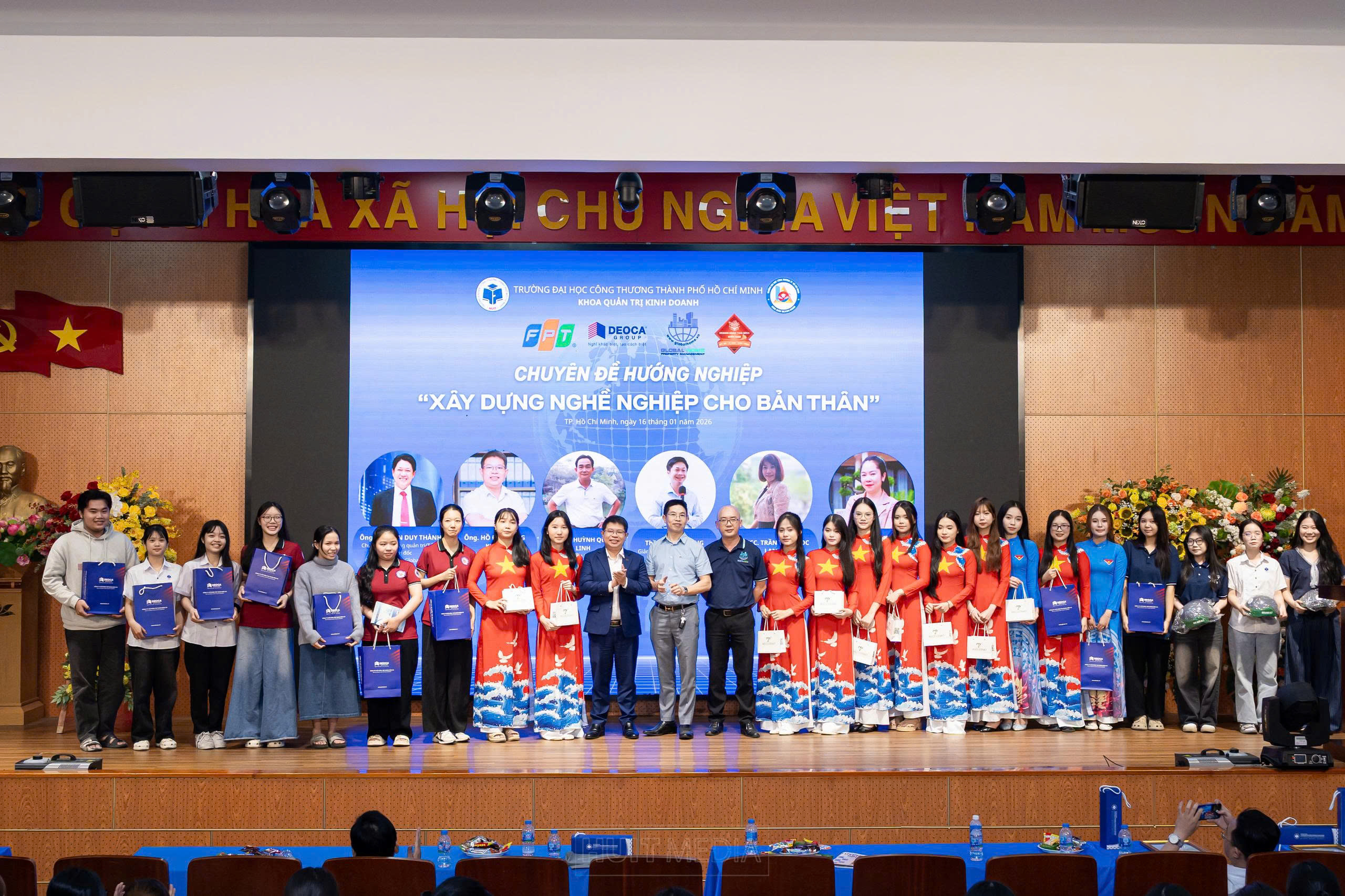 Tối ngày 16/01/2026, tại hội trường Khoa Quản trị Kinh doanh – Trường Đại học Công Thương TP.HCM đã diễn ra chuyên đề hướng nghiệp “Xây dựng nghề nghiệp cho bản thân”. Chương trình quy tụ gần 500 sinh viên, gần 30 doanh nhân – diễn giả cùng các thầy cô, tạo nên một không gian giao lưu ấm cúng, sôi nổi và giàu cảm xúc.